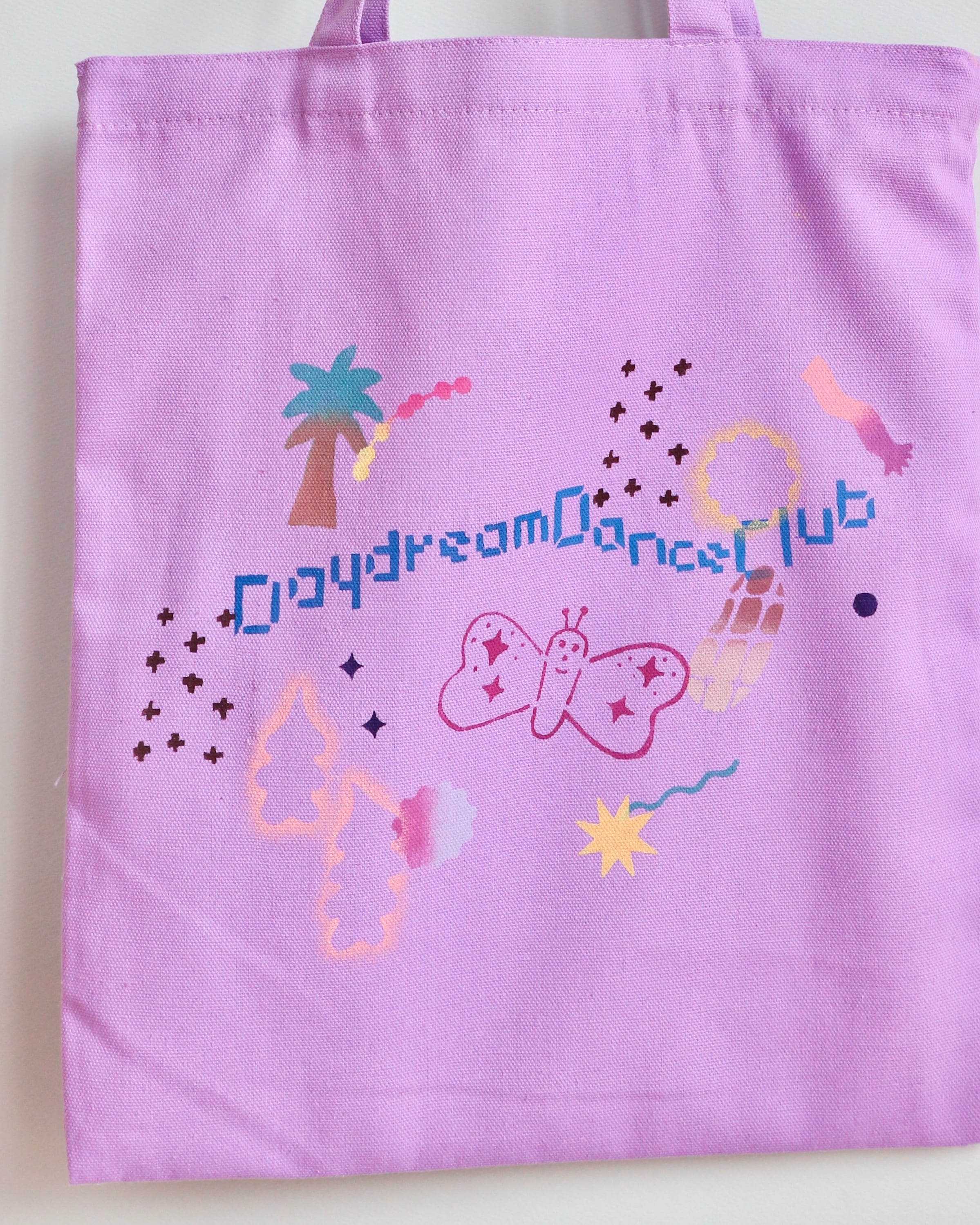 架空のダンスクラブ、"Daydream Dance Club"のオフィシャルグッズ、をイメージし、布用インク等でプリントしています。