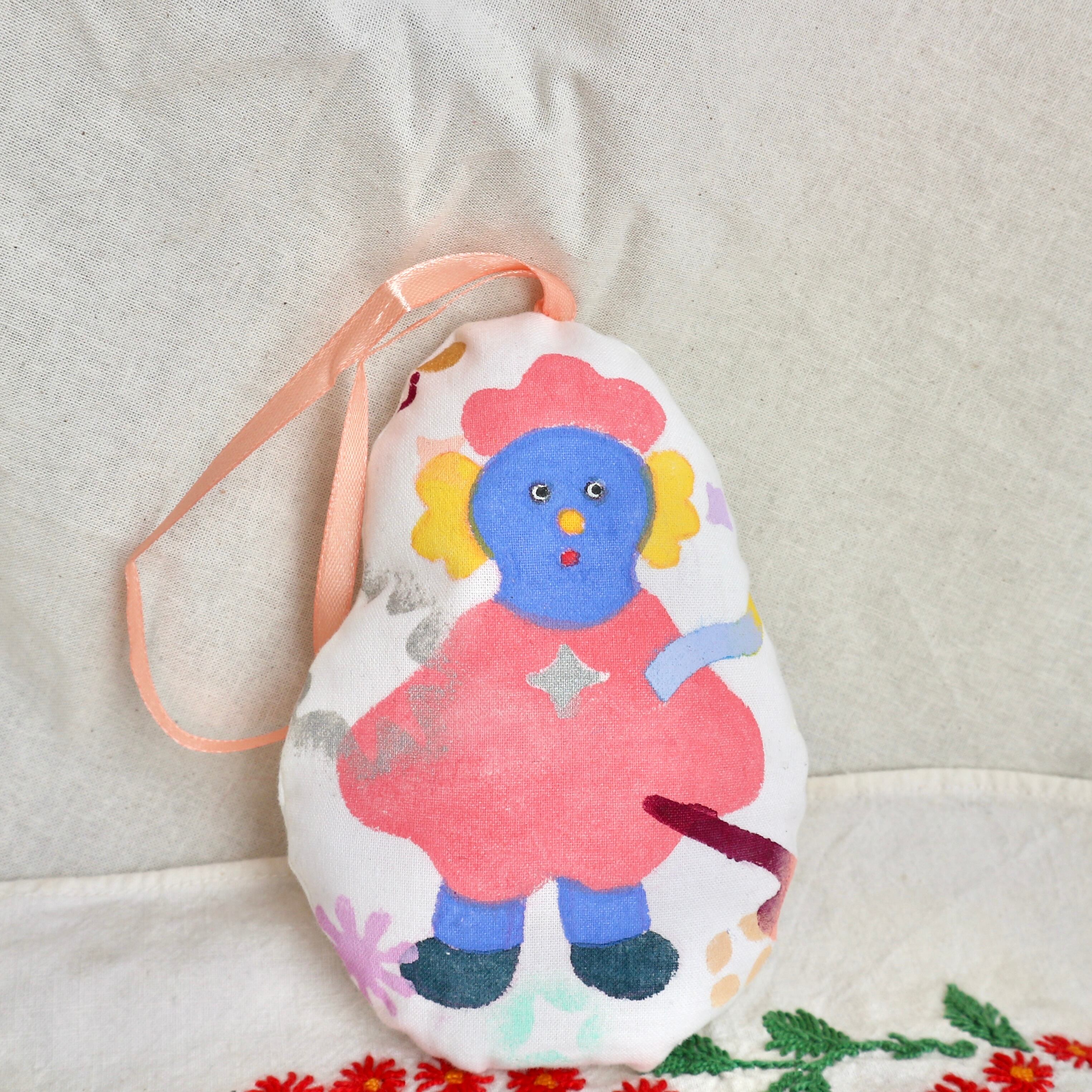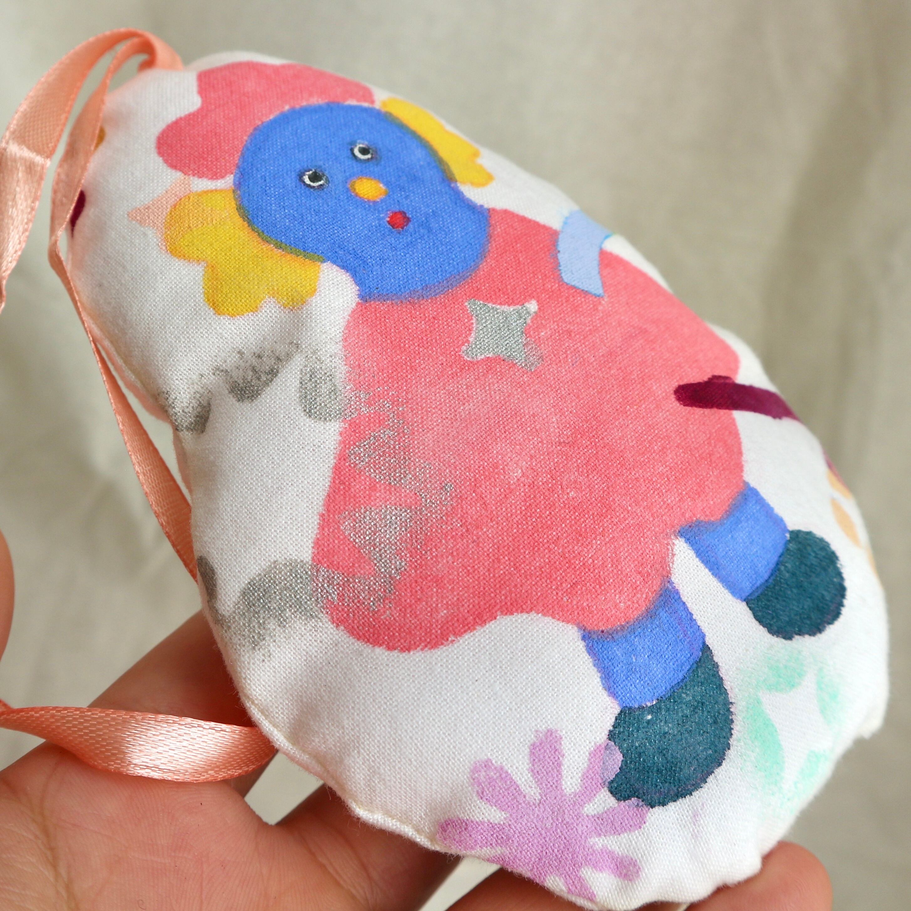 コットンに布用絵の具、ステンシルプリント、サテンリボン